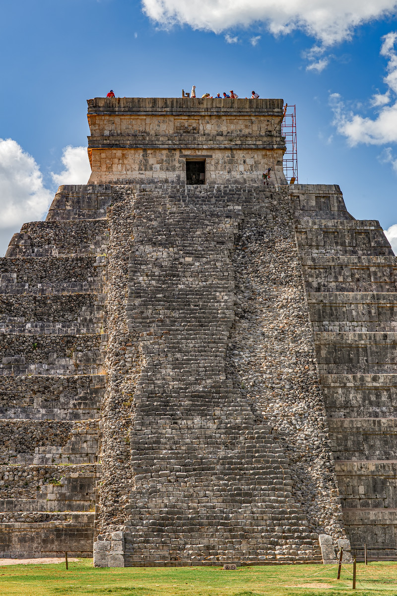 库库尔坎金字塔,建于9世纪,占地3000多平方米,由塔身和神庙两部分组成,高约30米。金字塔每面有91级台阶,4个面象征一年四季,共364级台阶,加上塔顶的神殿共365级,象征一年365天。