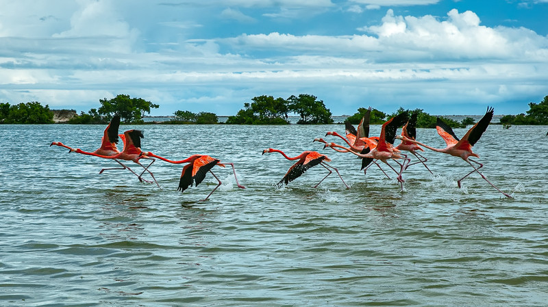 大片红树林是整个自然系统的核心,而火烈鸟则聚集在红树林之间的海水中,这里的海水盐度较高,火烈鸟主要以浅海中富含盐分的磷虾和其它藻类及浮游生物为生,也正是这些水藻中丰富的胡萝卜素成就了它们艳若桃花的美丽。