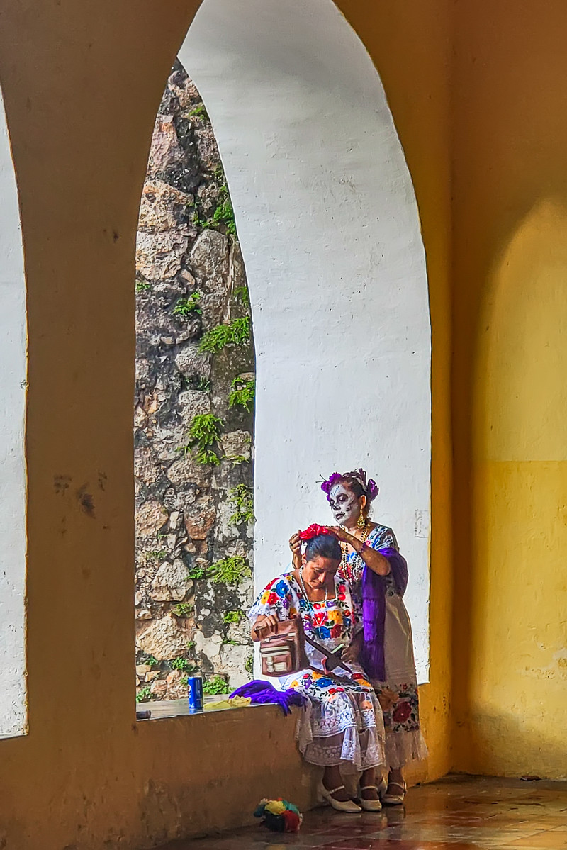 路上碰见一位化骷髅妆的姑娘,听她说今天晚上梅里达有个不小的有关亡灵节的祭祀游行活动,很遗憾我们今晚不住这儿,一会儿就奔乌斯马尔古城去了。