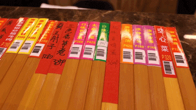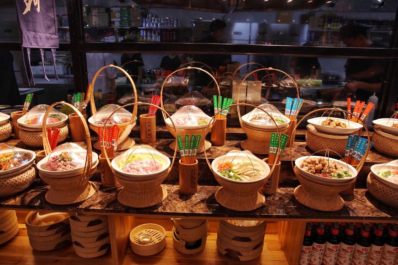 展台上摆着满目玲琅的菜品 用保鲜膜包着,作为点菜样本,等着被Pick 每道菜都配有一个签筒 签上写着菜品的基本信息:价格和名字
