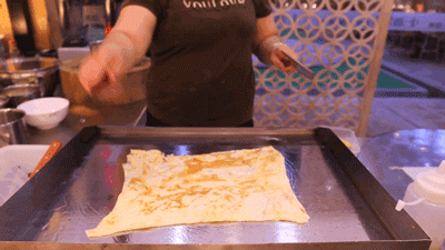 ☉ 榴莲飞饼 飞饼是现点现做的 有菠萝、榴莲和老干妈三种口味可选 如果你有兴趣,可以看店里的姐姐现场摊飞饼 P.S.摊飞饼的姐姐特别热情好客,人贼好