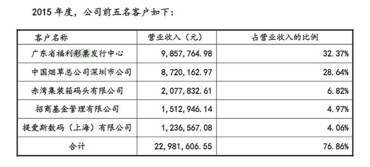 报告显示,在2015年度,悦诚达第一大客户为广东福彩,为其带来985万元的营业收入,占总营收32.37%。