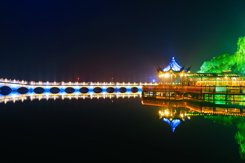 酒足饭饱,继续出发再逛一逛,从饭馆走出来时也不会感觉这么凉了。冬天一过七点钟点就暂停了游船服务,没办法再拍水上的船了,所以我们下一个目标就准备回到下午去过的全福长桥。