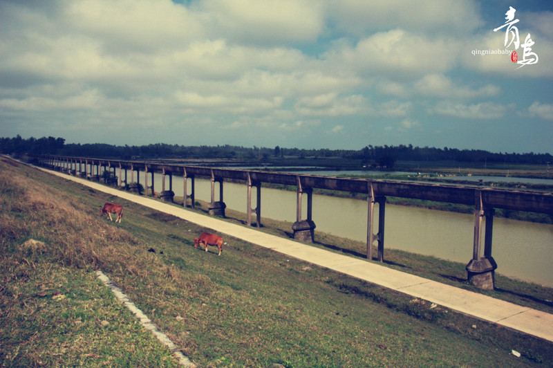这个不知名的水库快要干涸了,还有闲散的黄牛在高粱桥下吃草