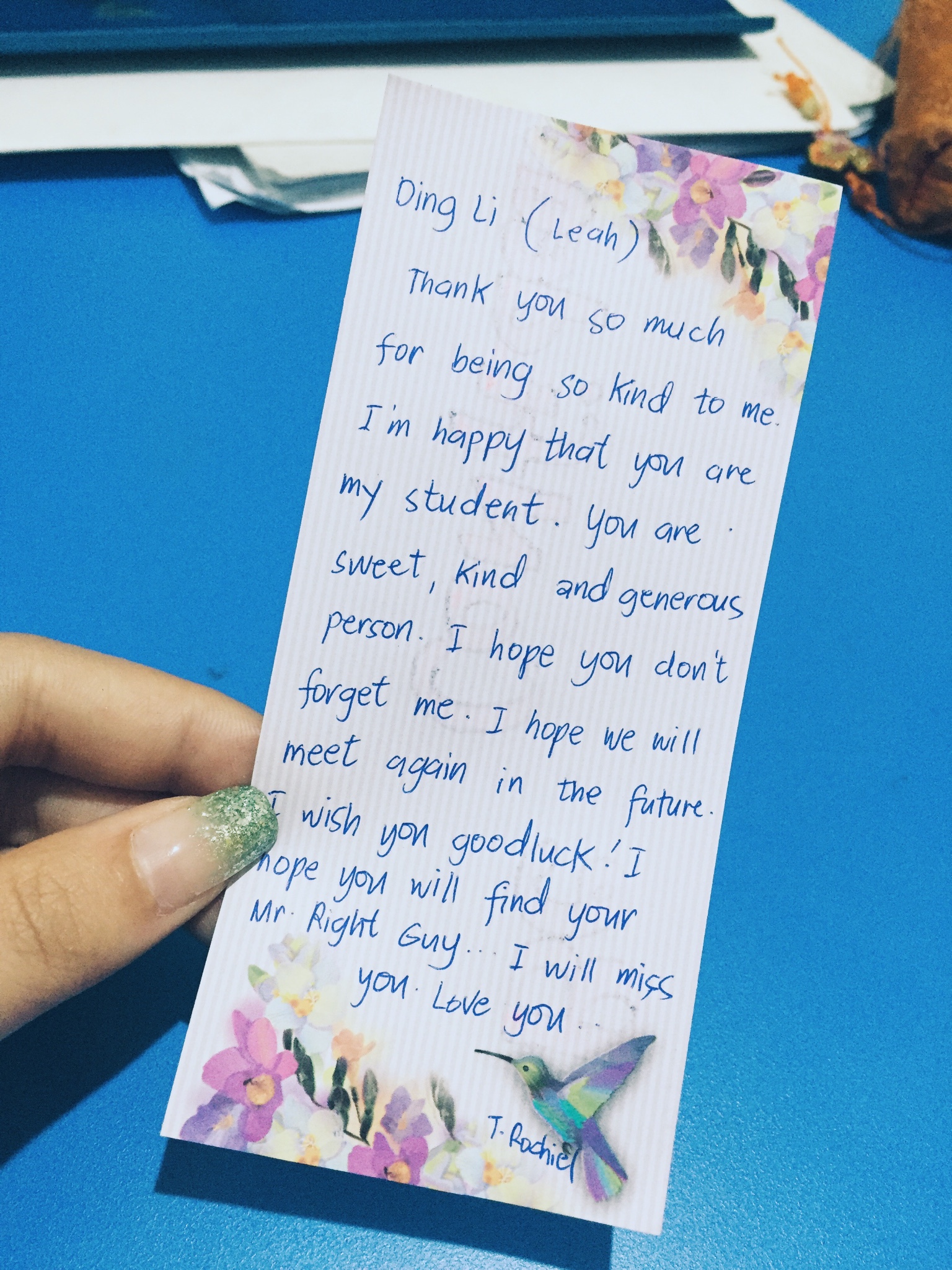 时间太匆匆,放飞自我的28天转眼就过去了。临走之前还收到了Rochiel写给我的信、祝我早日找到对的人